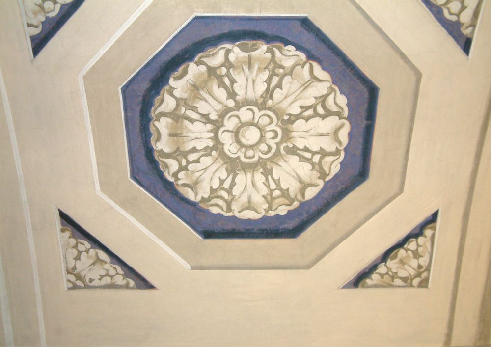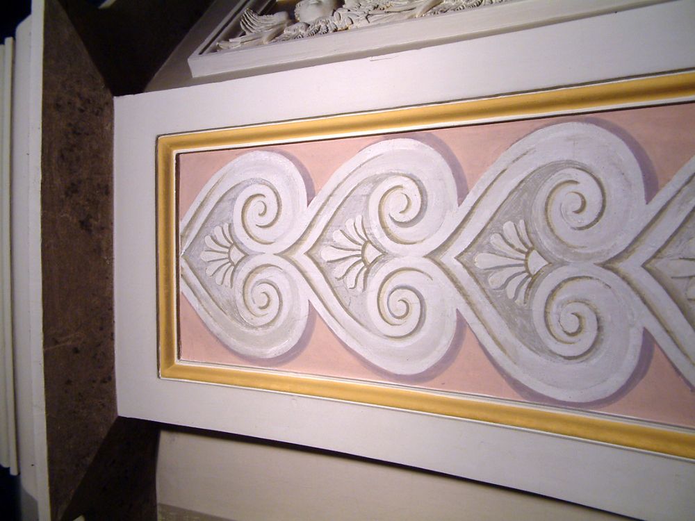 Anschließend folgte die Retusche der Belegfelder mit Klucel (Hausenblasenleim) und Pigmenten. Die Wände wurden flächig mit Capasilan lasiert.