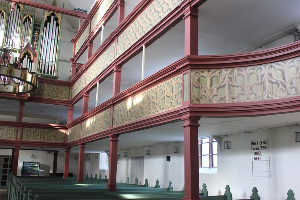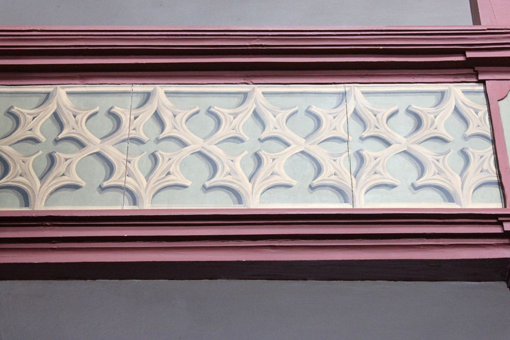 Fehlstellen in den wunderschön bemalten[nbsp]Emporenbrüstungen wurden gekittet. Daraufhin folgte die Retusche der Kittstellen und von Fehlbereichen in der Fassung. Zum Abschluss erhielten die Brüstungen einen Schutzüberzug.