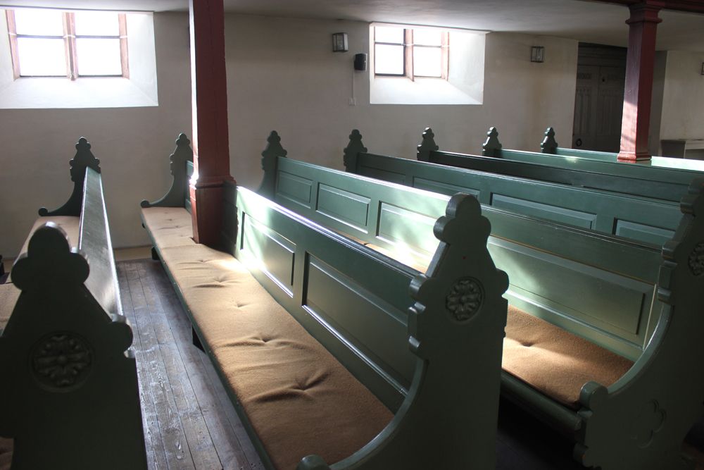 Die Raumschale wurde einschließlich der Fensterleibungen in historischer Kalklasurtechnik mit reinem, mehrjährig gelagerten Sumpfkalk in drei bis vier Lasuren bis zur vollständigen Reinheit des Farbtones[nbsp]getüncht.
