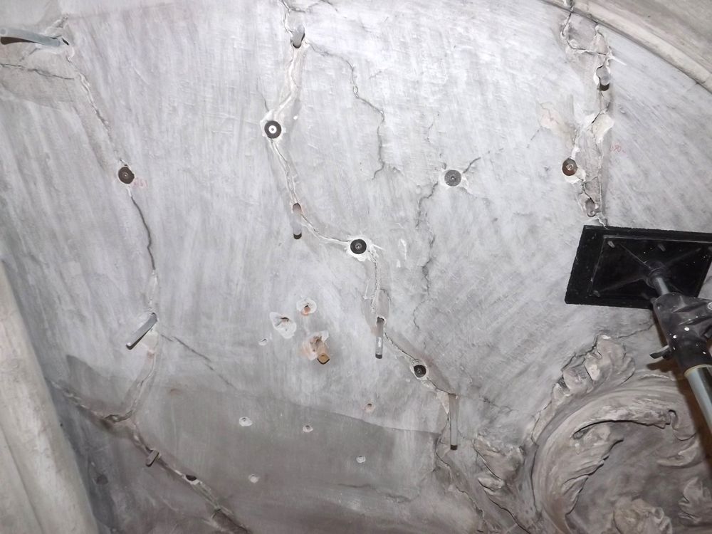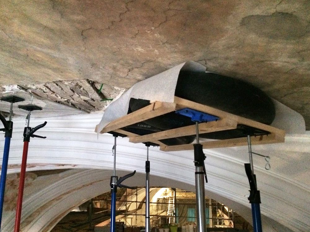 Statische Risse im Mauerwerk der Gurtbögen wurden kraftbündig stabilisiert. Hierfür wurden lockere Putze abgenommen, Stuckaturen und Fresken mittels Cyclododecan geschützt. Die Risse wurden sodann verdämmt und Schläuche oder Packer eingesetzt, über die die Verfüllung der Hohlbereiche mit Trasskalkinjektionsmörtel erfolgte.