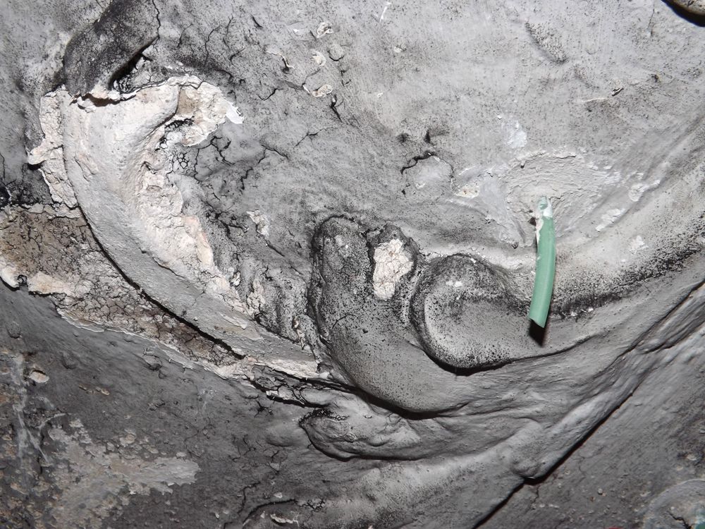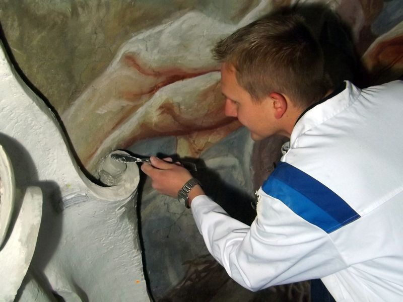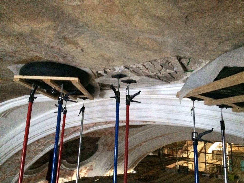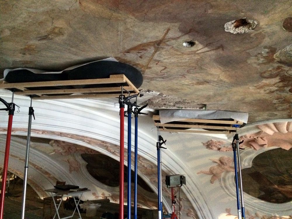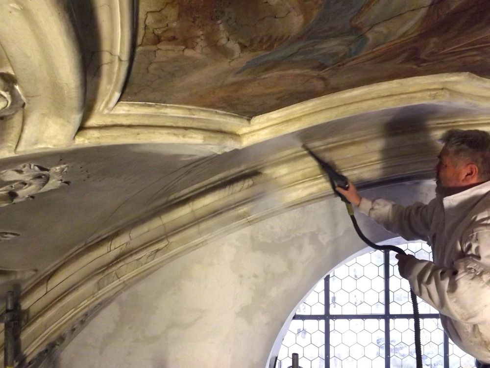 Anschließend wurde die sichtbare, sehr stark verschmutzte und fleckige Kalkfassung durch vorsichtiges Abkehren mit Borstenpinseln bei gleichzeitigem Absaugen gereinigt. Besondere Vorsicht galt stuckierten Bereichen und vorhandenen Stuckprofilen sowie dem behutsamen Anarbeiten an die Deckenfresken.
