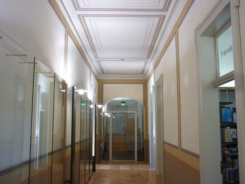 Die vorhandene Stuckatur wurde ausgebessert und teilweise als Antragsstuck nach bestehendem Vorbild erneuert. Profilierter Stuckgips wurde reprofiliert.