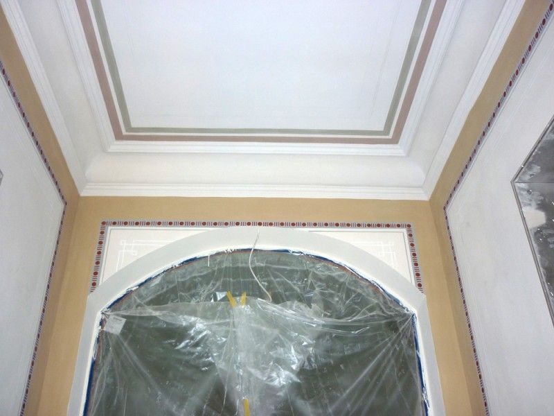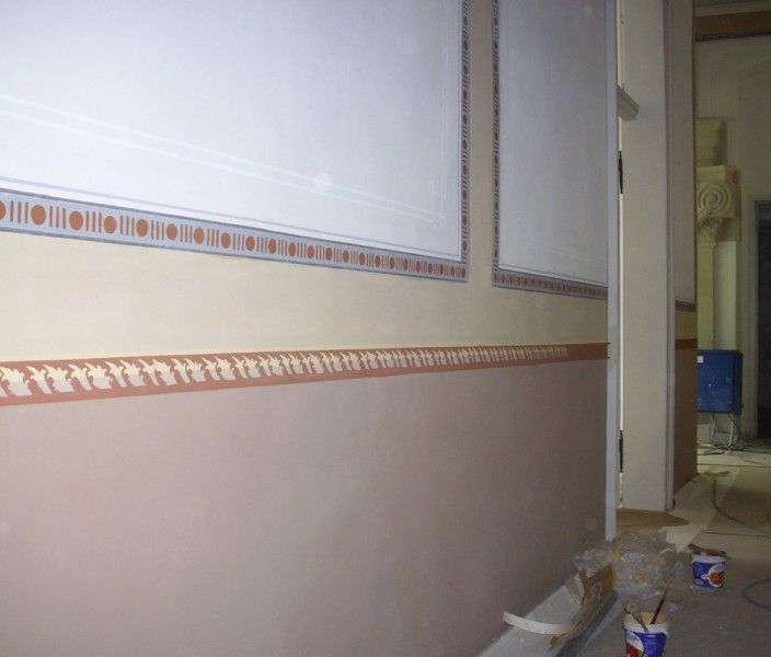 In anderen Bereichen wurden Stuckprofile in unserer Werkstatt[nbsp]im Tischzug gezogen und die Elemente anschließend angebracht und vorsichtig verdübelt.