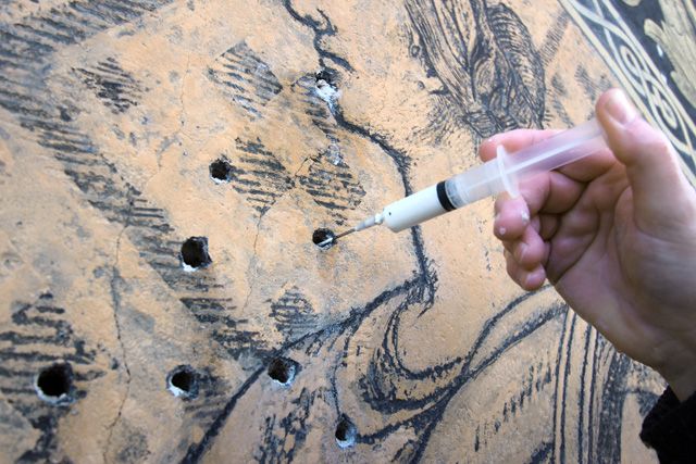 Nach sorgfältiger Sondierung hohlliegender Bereiche wurden vorsichtig Bohrungen für Injektionskanülen, Packer oder Mikronadeln gesetzt. Die Konsolidierung dieser Bereiche und deren Wiederanbindung an tragfähige oder bereits gefestigte Bereiche erfolgte durch Hinterfüllung in einem mehrstufigen Vergelungsverfahren. Nach Einbringen einer Vorfestigung wurde die händisch angemachte Hinterspritzmasse in abgestimmten Verdünnungsstufen injiziert.