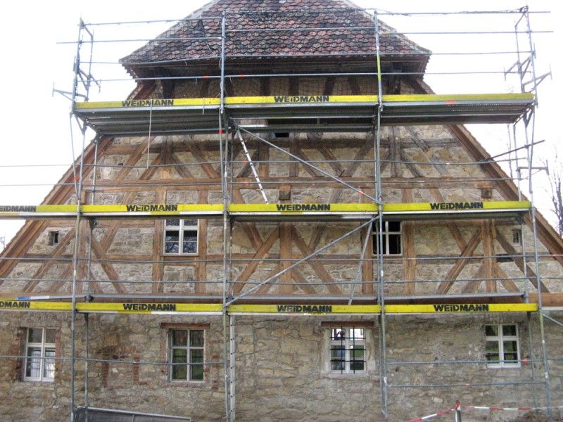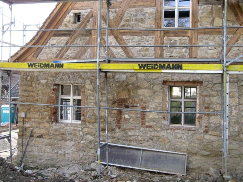 Die unter Kalkputz liegenden historischen Fachwerke wurden freigelegt, konserviert und in die Neuverputzung der Gefache sichtbar eingebunden. Der ursprüngliche, farbig unbehandelte Kalkverputz wurde im Neukonzept ebenso wieder aufgenommen wie der originale Naturton der Fachwerkhölzer.