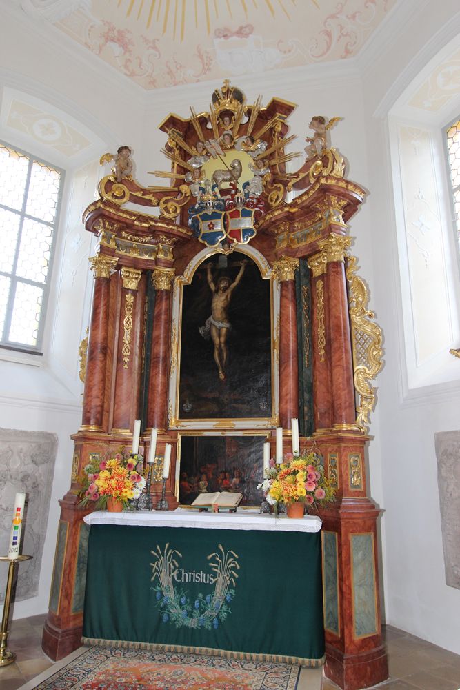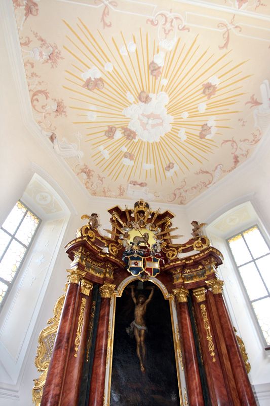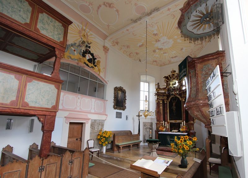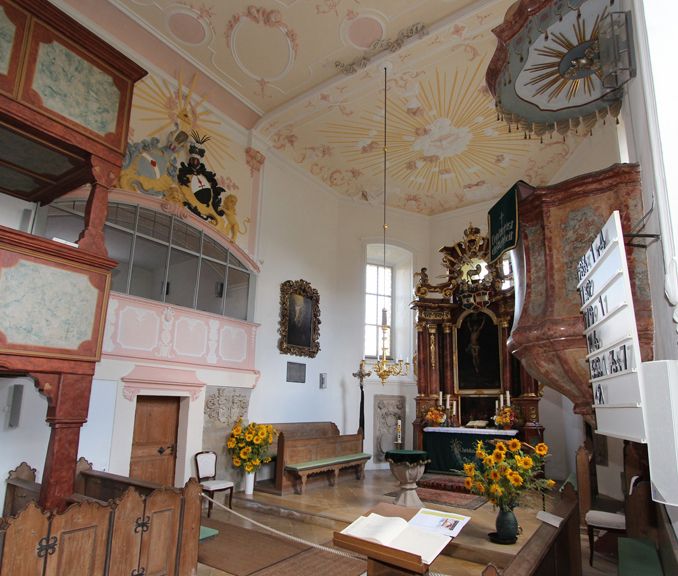 Das Gotteshaus ist in schlichtem Barock gehalten, eine kleine Saalkirche mit hochrechteckigen Fenstern und dreiseitig geschlossenem Chor.[nbsp]Die Lage im hügeligen Burggelände bringt es mit sich, dass der Eingang in die Kirche in der Mitte der südlichen Längsachse ist. Durch das ansteigende Burggelände gelangt man von hinten direkt in die erste Empore.