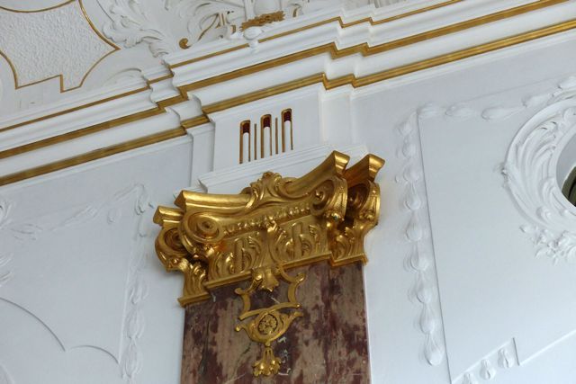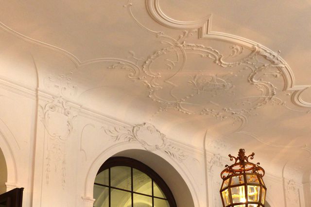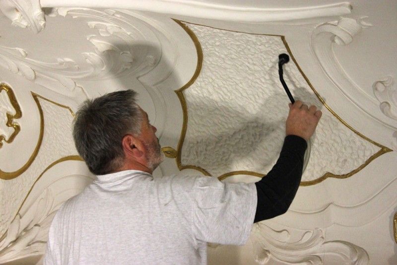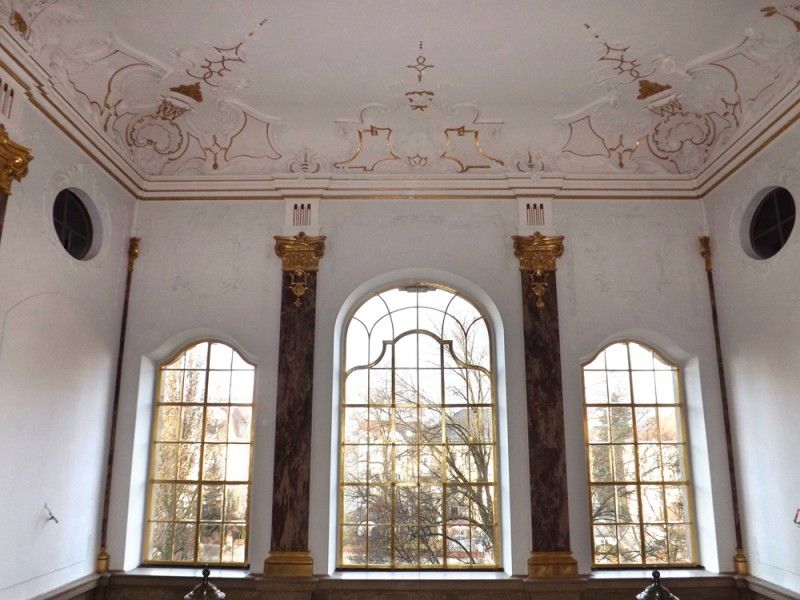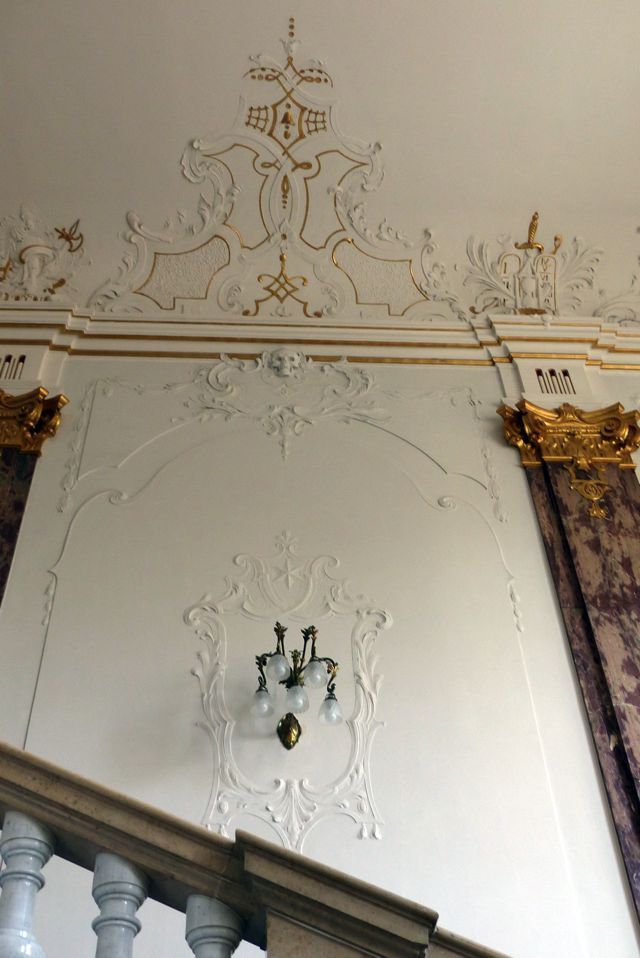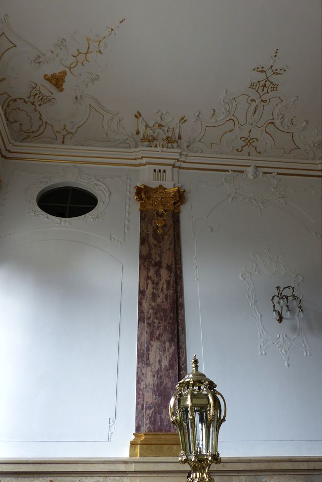 Fehlende Stuckelemente sowie Stuck- und Putzschäden wurden ergänzt und rekonstruiert. Diese Instandsetzung beinhaltete auch die selektive Reparatur der Substruktion. Struktur, Modellierung und Form wurden dem Bestand entsprechend angeglichen. Alle Ergänzungen orientierten sich an bauzeitlicher Stucktechnik und Werkstoffqualität. Fehlstellen, Ergänzungen sowie durchgeriebene Bereiche an Decken und Wänden wurden in Leimfarbtechnik unter Zugabe von Kreide und Pigmenten retuschiert, wobei auch der Glanzgrad dem Bestand angepasst wurde. Putzschadstellen im Sockelbereich wurden nach Trockenreinigung und Auskratzen versalzter Mauerfugen in mehrschichtigem Kalkputzsystem erneuert. Ausformung und Oberflächenbeschaffenheit der Deckschicht wurden an den Bestand angeglichen. Die farbige Retusche wurde in Silikattechnik ausgeführt. Fehlstellen in den Vergoldungen auf Stuck wurden mit Bolus vorretuschiert und im Falle kleinerer Bereiche mit Pudergold eingestimmt. Größere Fehlbereiche wurden mit einer Goldauflage versehen und im Glanzgrad angepasst. Die Neufassung von Wänden und Leibungen erfolgte in untergrundkompatibler, farblich jeweils bestandswiederholender Innensilikattechnik in zweischichtigem Aufbau.