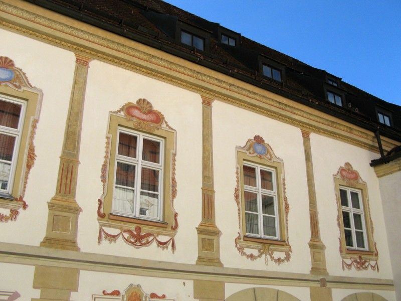 Die schöne Bemalung der Kalkfarbfassung an der Fassade wurde sodann mit artgleichem Material retuschiert. Fehlstellen, Kittungen und ähnliches wurden so mittels Lasuren farblich eingestimmt. In Teilbereichen fand eine Ergänzung der Bemalung statt.