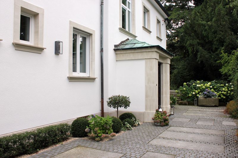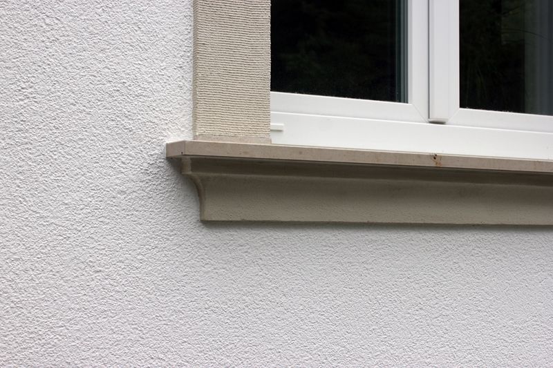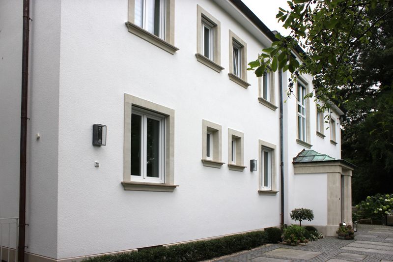 Daraufhin wurden systemzugehörige WDVS-Mineraldämmplatten mit Leichtmörtel dichtgestoßen und fugenfrei auf den trag- und klebefähigen Untergrund aufgebracht. Die WDVS-Platten wurden im Wulst-Punkt-Verfahren angeklebt und mit Richtlatten angedrückt. Für Rolloschienen wurden Aussparungen hergestellt. Auf die bauseits vorhandenen Rollokästen aus Ziegeln sowie in Fenster- und Türleibungen wurden systemzugehörige Leibungsplatten angeklebt und so erhabene Leibungen herausgearbeitet. Die Faschen wurden danach mittels Zahntraufel nach Bestand mit Rillenstruktur versehen. Entsprechende Lasuren verliehen ihnen danach die Anmutung von Sandstein.