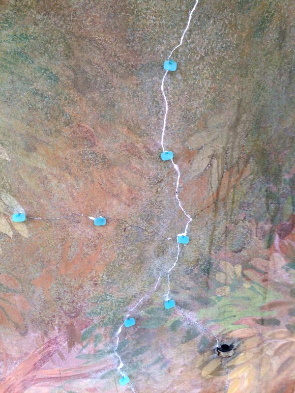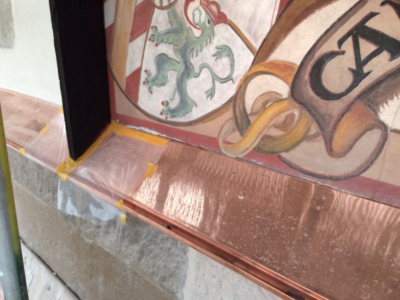 Hohlliegende Putzflächen im Musterbereich wurden durch punktuelle Vernadelung mit V4A-Klebeankern bestehend aus Schrauben und Beilagscheiben aus rostfreiem Edelstahl ins darunter liegende Bruchsteinmauerwerk gesichert. Die Beilagscheiben wurden vertieft eingesetzt und die Fehlstellen über den Ankerlöchern mit mineralischem Mörtel geschlossen.