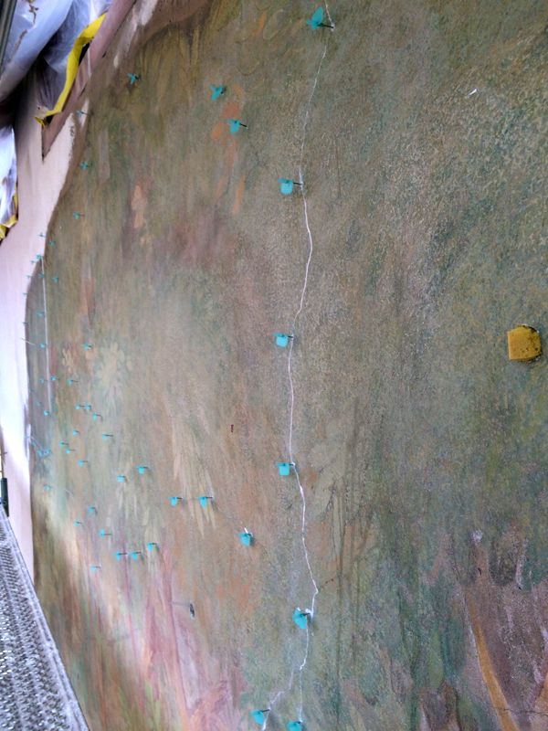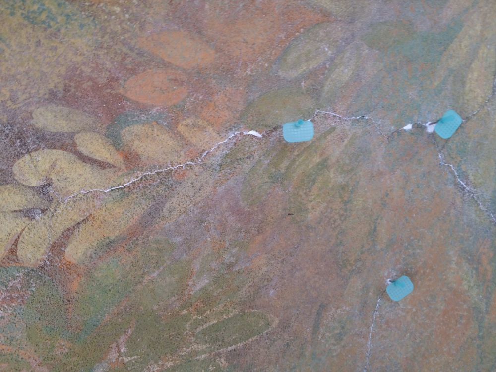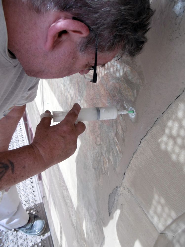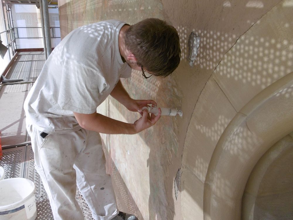 Hohllagen wurden über durch vorsichtiges, schlagfreies Bohren geschaffene Injektionskanäle und über Risse mit einer Mikrozementsuspension hinterfüllt. Risse wurden mit mineralischem Mörtel geschlossen.