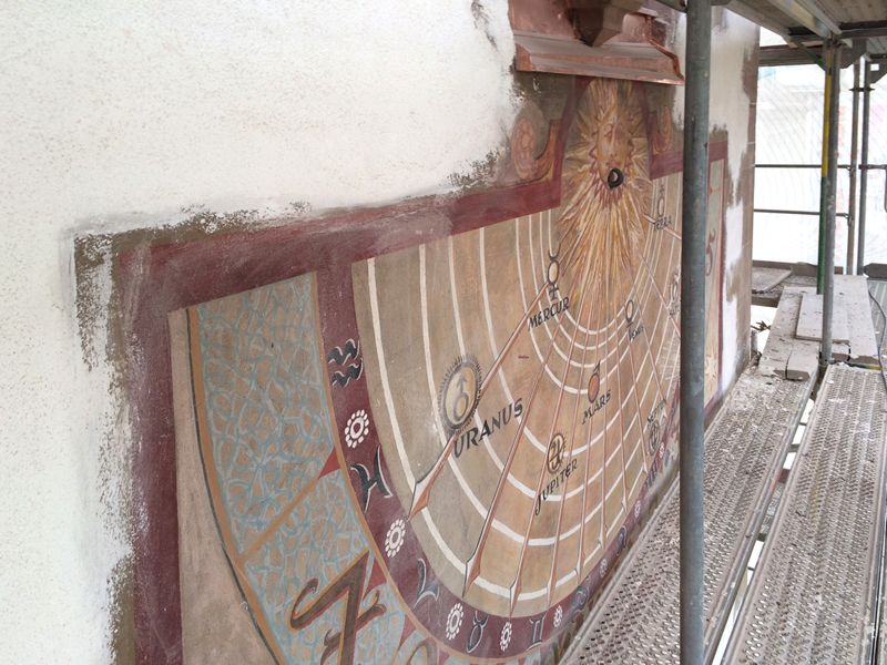 Die in hellen Farben aufgetragene Malerei wirkt nach einem Jahrhundert Bestand sehr blass und unscharf, da im Zuge früherer Restaurierungen Reinigungen, Retuschen und Übermalungen vorgenommen worden sind. Die Randbereiche sind vom letzten Fassadenanstrich verunklärt.