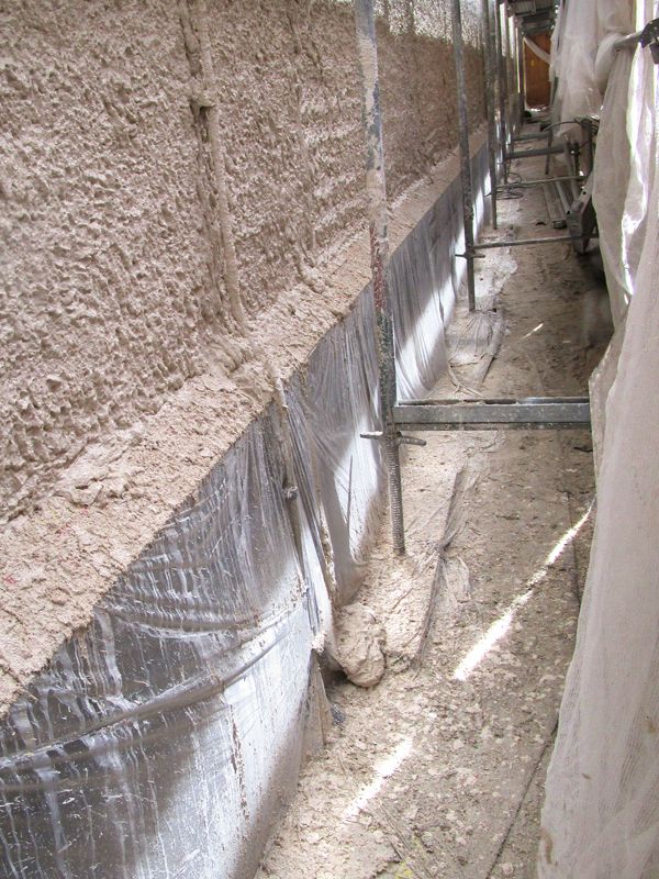 Packer wurden entlang der Rissverläufe eingebaut. Die Injektion erfolgte mithilfe von Kanülen oder Handpumpen in mehreren Durchgängen. Um ein Abheben von losen Putzschichten zu vermeiden, wurden die Injektagen ohne Druck ausgeführt. Nach erfolgreicher Hinterfüllung wurden Packer und Kanülen ausgebaut und Injektionslöcher mit Kalkmörtel verschlossen.