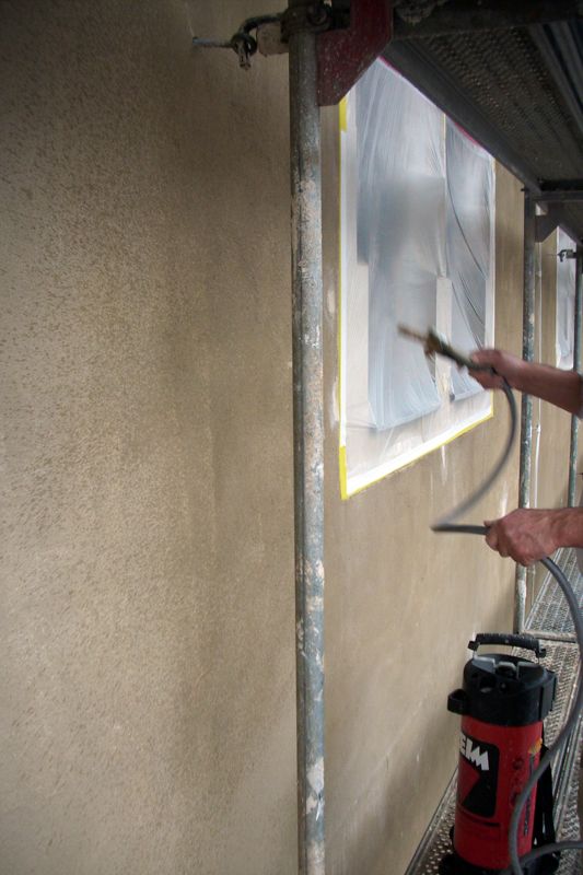 Nach Abtrocknen wurden Neuputzflächen satt mit entsprechend verdünnter KEIM Ätzflüssigkeit eingestrichen und so neutralisiert. Die behandelten Flächen wurden mit Wasser nachgewaschen.