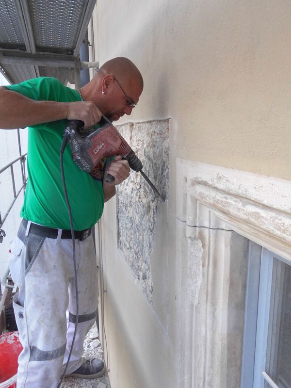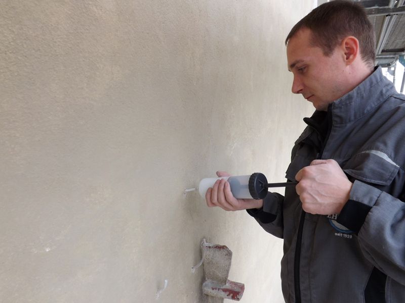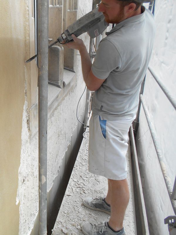 An der Fassade zeigten sich verschiedene Risssysteme, die vereinzelt von flächigen Hohlstellen begleitet wurden. Die Hinterfüllung mit hydraulischer Injektionsmasse sollte eine Wiederanbindung des Putzes an den Untergrund gewährleisten.