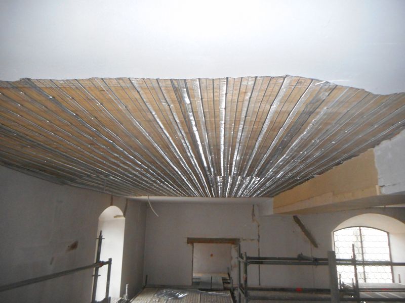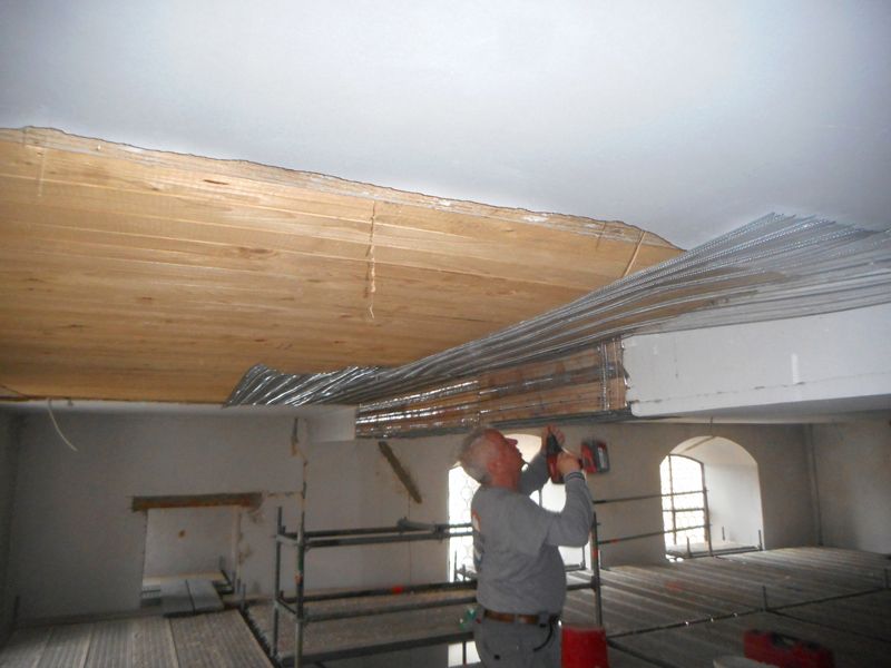 Als Unterkonstruktion für den Deckenputz wurde eine Rauhspundschalung eingebaut. Als Putzträger wurde Streckmetall auf die Schalung montiert. Auf diesen Untergrund wurde Unterputz flächig in zwei Schichten aufgetragen, abgezogen und aufgeraut. Darauf folgte Kalkfeinputz als Oberputz.