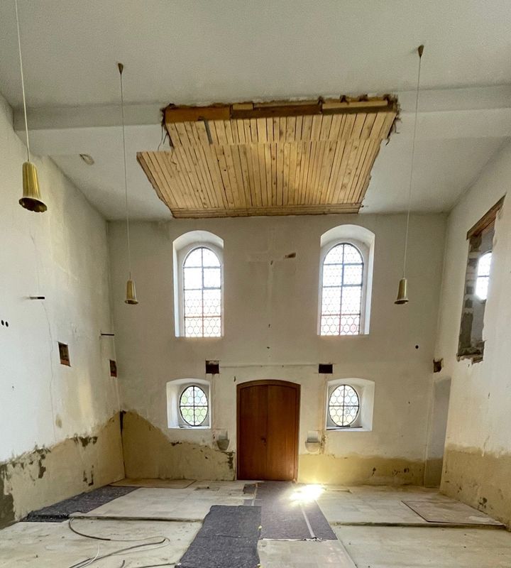 Bauteile wie Altar, Balustrade etc. wurden zum Schutz staubdicht mit Folien abgedeckt. Holz- und Natursteinböden wurden mit Malervlies und OSB-Platten abgedeckt. Fenster und Türen wurden mit PE-Folie abgeklebt.