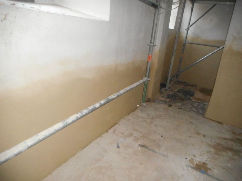 Der Untergrund wurde verfestigt und zweifach vorgenässt. Ein netzförmiger Spritzbewurf mit hohem Sulfatwiderstand wurde mit 50% Untergrunddeckung als Haftbrücke aufgebracht. Als Ausgleichs-, Unter- und Oberputz folgte Sanierputz. Kleinputzflächen und Installationsschlitze wurden ebenfalls geschlossen.