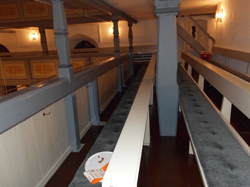 Der Bestand wurde gründlich feucht gereinigt. Neuholzteile wurden vor flächiger Bearbeitung farblich eingestimmt. Anschließend erhielten Riemenbretter und Stufen einen pigmentierten Anstrich. Auch die Treppe im Turmraum sowie die Kanzeltreppe wurden gereinigt und wie Bestand lasiert.