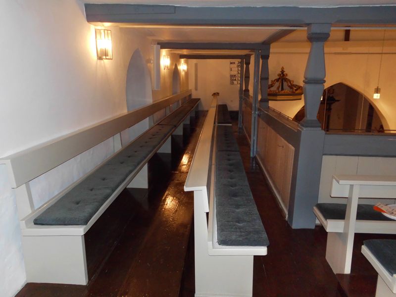 Die Bänke wurden angelaugt, angeschliffen und gereinigt. Anschließend folgte die Neulackierung entsprechend der Bestandsfarbtöne. Auf die Wangen der neu lackierten Bänke im Erdgeschoss wurden eine Umrandung sowie die Nummerierung ebenfalls dem Bestand entsprechend aufgemalt.