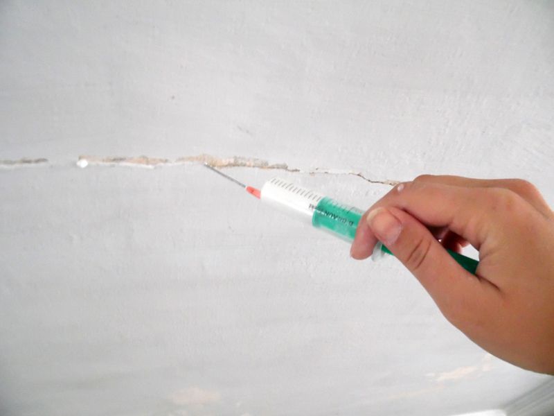 Nach Aushärten und Trocknung erfolgte eine Vorinjektion des Klebebereichs in der Schalung bzw. im Mauerwerk. Dann wurden die Nadelanker über das Bohrloch ins Tragwerk gesetzt und in der Putzebene verklebt.