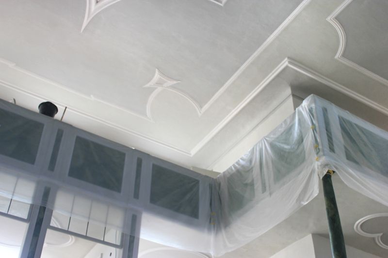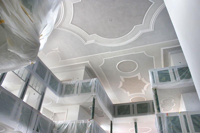 Bei jüngeren Putzinstandsetzungen sowie bei der Rissinstandsetzung waren vorwiegend gipshaltige Fertigputzmörtel, Fertigspachtelmassen bzw. Baugips verwendet worden. In Risszonen bzw. an den Rissflanken wiesen die Überscheibungen deutliche Haftungsmängel auf. Diese nicht tragfähigen bzw. strukturgeschwächten Zonen wurden im Zuge der Putzinstandsetzung gegen ein homogenes Kalkputzsystem mit bestandsorientierter Glättschicht bzw. Stuckmörtel ausgetauscht.
