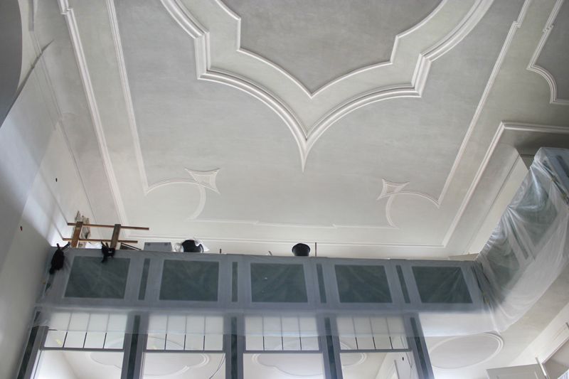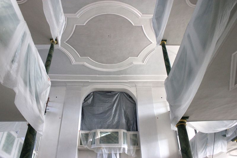 Die Untergrundinstandsetzung von Wänden, Decken und Emporenuntersichten umfasste Putzreparatur, Risskittung, Putzergänzung und die Restaurierung der Stuckatur.Das Ziel war eine vollständige Instandsetzung der Schadenszonen in dem Umfeld angepasster Oberflächenstruktur und Verdichtung.