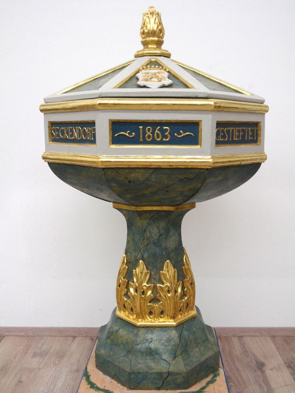Taufstein, Kanzel, Altartisch und Emporensäulen wurden gereinigt, konsolidiert und restauriert.