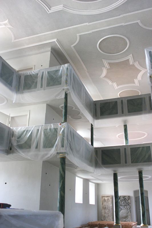 Die grundlegenden Arbeitsschritte der Untergrundinstandsetzung setzten sich wie folgt zusammen. Nägel und Schrauben wurden grundsätzlich ausgebaut. Rissstrukturen wurden gereinigt. Hohlliegende Putze und Rissflanken wurden mit mineralischem Injektionsmörtel gefestigt und so wieder eine Haftung mit dem Mauerwerk hergestellt. Auch breite Risse wurden mit Injektionsmörtel ausgespritzt und repariert. Störungen, Löcher und Verletzungen wurden ebenfalls putztechnisch repariert. In überbreiten bzw. absehbar bewegungsrelevanten Zonen wurde armierendes Gewebe eingebettet. Störende Übergangszonen in bestehenden Reparaturflächen wurden nachgebessert. Putzanschlüsse zu wandgebundenen Bauteilen sowie zu den Steinböden wurden instand gesetzt. Mauersalzbelastete Kleinflächen wurden ausgetauscht. Stuckaturen wurden stuckbildhauerisch und in Zugtechnik mit eigens hergestellten Zugschablonen instandgesetzt. Absturzbereiche wurden neu hergestellt.