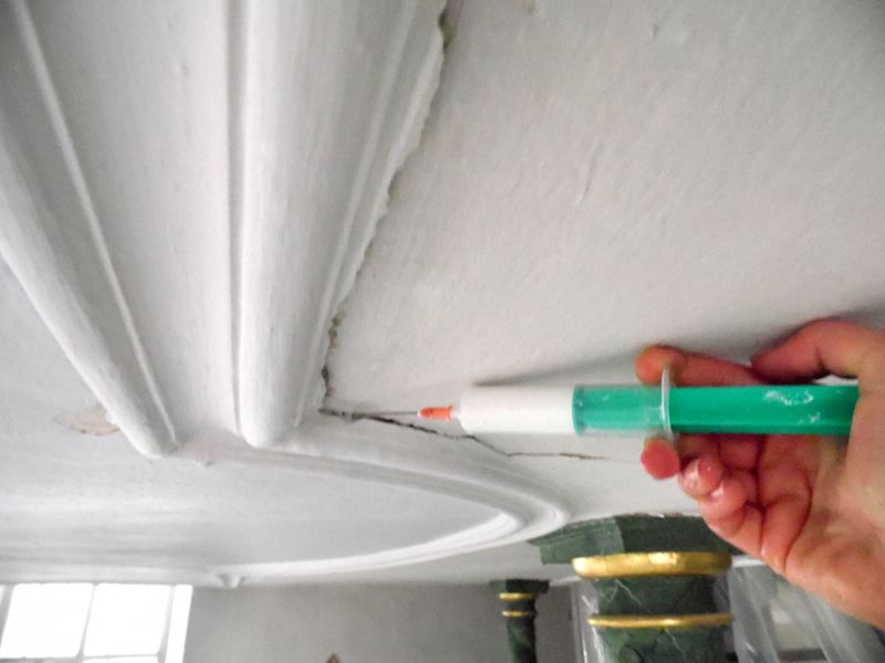 Die Zugänglichkeit für die Injektionen wurde wo nötig mittels dünner Bohrungen und temporär gesetzter Packer hergestellt. Wo möglich erfolgten sie über das bestehende Risssystem. Zugangsbohrungen und Risszugänge wurden nach Abschluss gekittet und retuschiert.