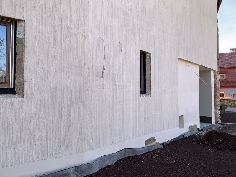 Zur Abdichtung gegen Spritzwasser wurde im Sockelbereich mineralische Dichtschlämme gestrichen.