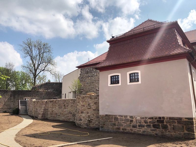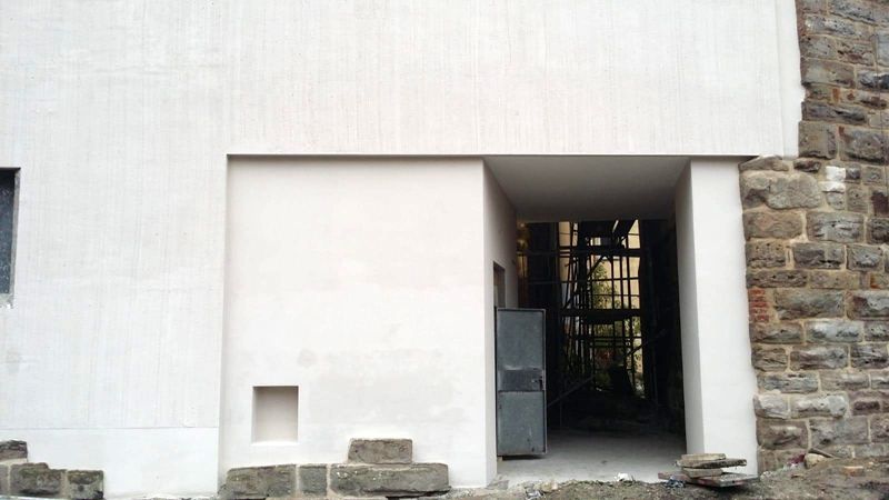 Vertiefungen im Untergrund der Wandflächen wurden ausgemauert. Der Unterputz wurde zweilagig aufgebracht. Die Flächen erhielten eine Armierung aus Glasfasergewebe. Der Modellierputz orientierte sich an den originalen Putzoberflächen.