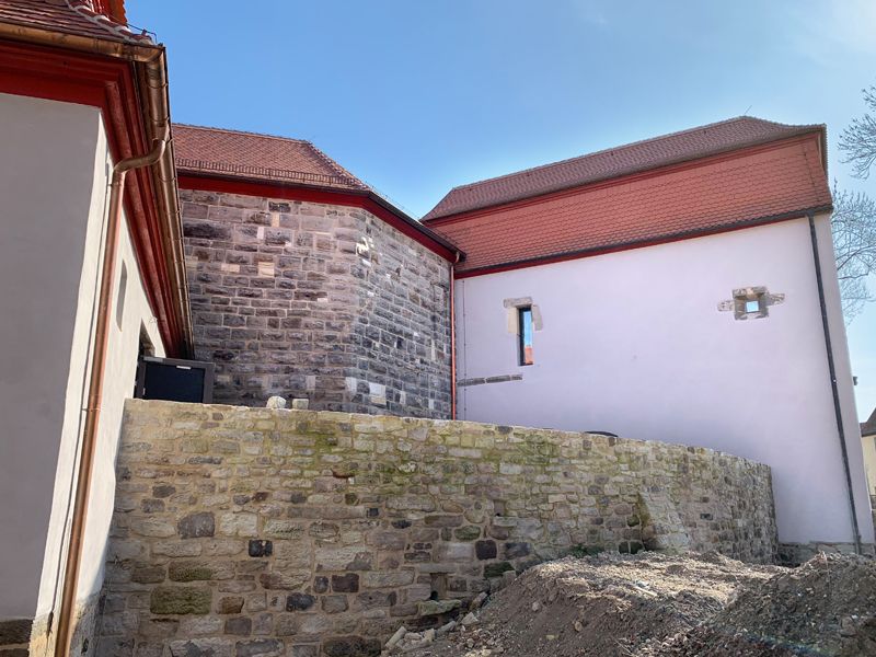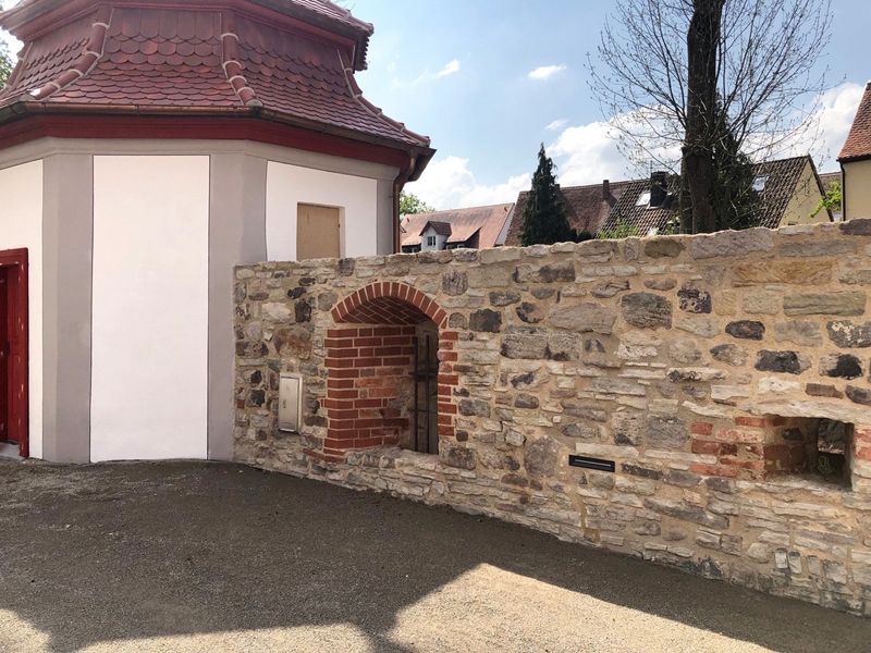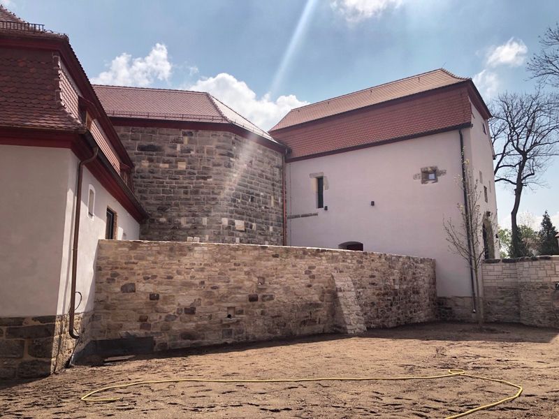 Fugenmörtel im aufgehenden Mauerwerk wurden ausgearbeitet. Die neu zu verfugenden Bereiche wurden mit[nbsp] Druckluft gereinigt. Als Vorbehandlung erfolgte eine Tiefenverfugung. Die mineralische Deckverfugung sorgte für einen Verschluss der Fugen, um ein Eindringen von Wasser in das Mauerwerk über die Fugen zu verhindern. Der mineralische Mörtel wurde hohlraumfrei per Hand eingebracht und abgezogen. Die Fugenoberflächen wurden glatt abgezogen und leicht konkav ausgebildet.