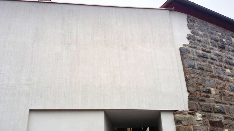 Als Vorbereitung für die Silikatbeschichtung wurden die Flächen mit wasserverdünnter Ätzflüssigkeit behandelt. Die Beschichtung erfolgte deckend mit KEIM Granital.