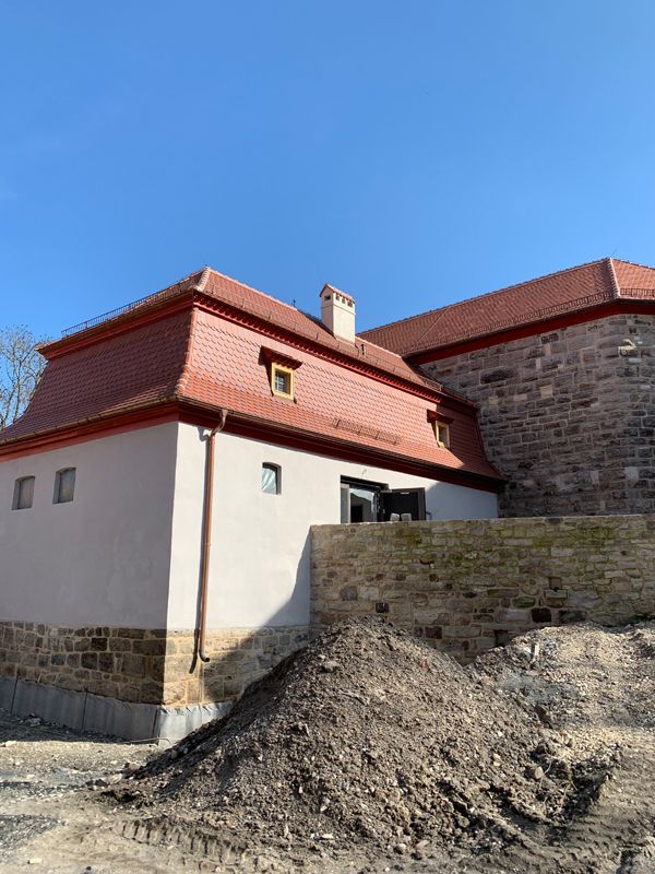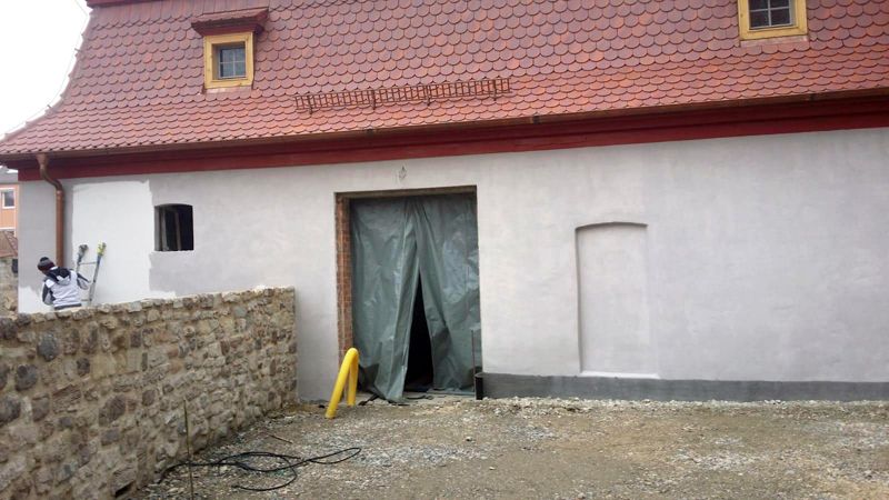 Vertiefungen und Unebenheiten im Mischmauerwerk wurden egalisiert und ausgemauert. Ein Unterputz aus mineralischem, zementfreiem Werktrockenmörtel wurde zweilagig aufgebracht. Die Flächen erhielten eine Armierung aus Glasfasergewebe als separate Spachtelung.
