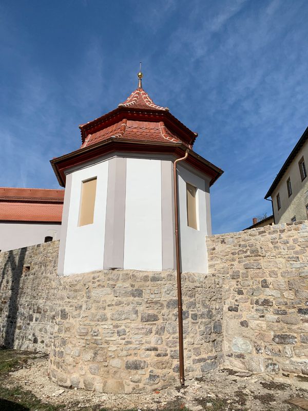 Der Außenputz wurde saniert. Zur Angleichung der Oberflächenqualität zwischen Alt- und Neuputz wurden einzelne Putzoberflächen mit kalkgebundenem Feinspachtel überarbeitet.[nbsp] Die Oberflächen der Ergänzungen wurden dem Original entsprechend ausgebildet. Ziel war die Ergänzung und Aufarbeitung der originalen geglätteten Oberflächen sowie deren Vorbereitung für die Neufassung.