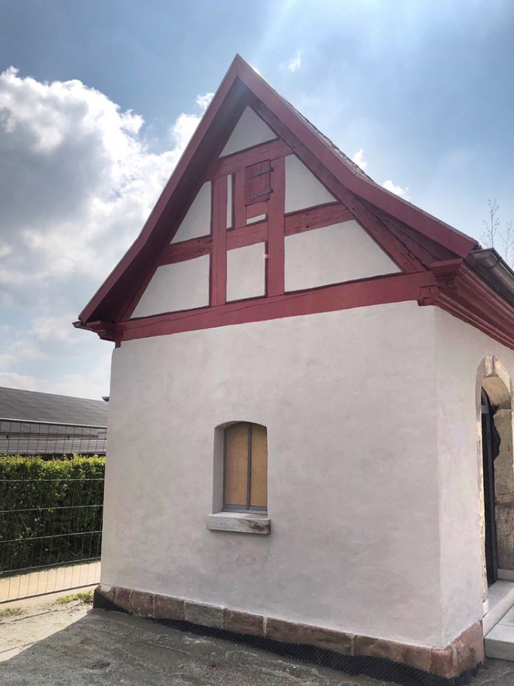 Die Fachwerkwand wurde gereinigt. Die Fachwerkfelder erhielten einen wasserabweisenden, geglätteten Kalk-Zementputz. Entlang des Balkenholzes wurden Kellenschnitte angebracht.