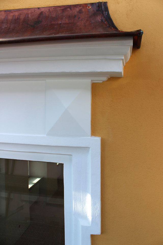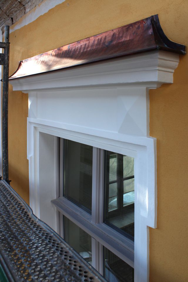 Für die Zugarbeiten vor Ort wurden eigens Zugschablonen und alle erforderlichen Hilfsmittel hergestellt. Anschließend erfolgte die Neustuckierung nach historischem Vorbild in mehreren Arbeitsgängen.