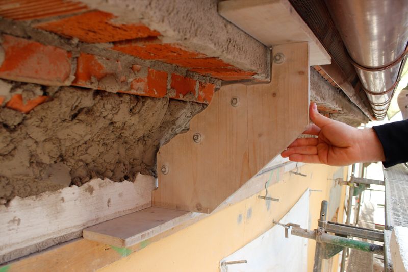Nach eingehender Sondierung wurden hohlliegende Putze durch Einbringen einer Vorfestigung und Hinterfüllen mit Injektionsmörtel in einem mehrstufigen Vergelungsverfahren konsolidiert.