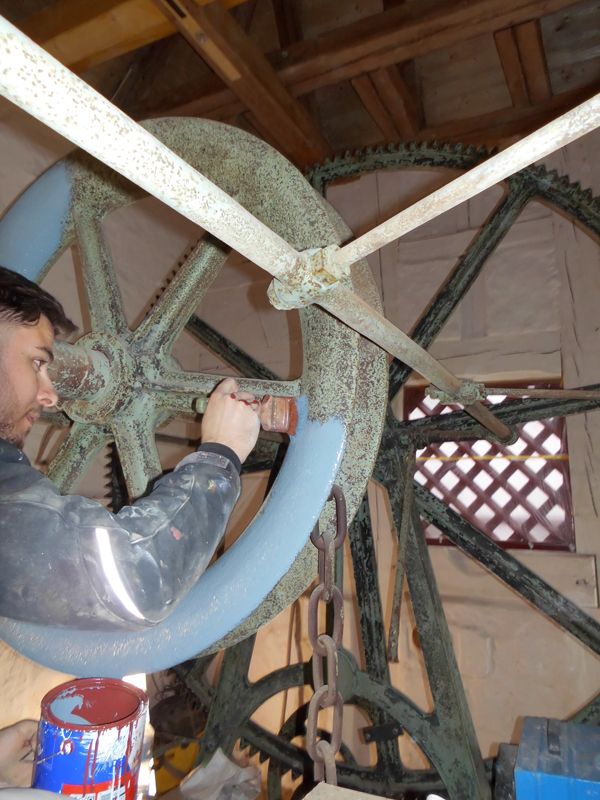 Das komplette Wasserförderwerk inklusive der Befestigungsstreben und -schrauben, das Geländer, die Ersatzkettenaufhängung, die Ersatzkette sowie das kleine Gitter in der Nische der Kommunwand waren mit Kunstharz beschichtet.