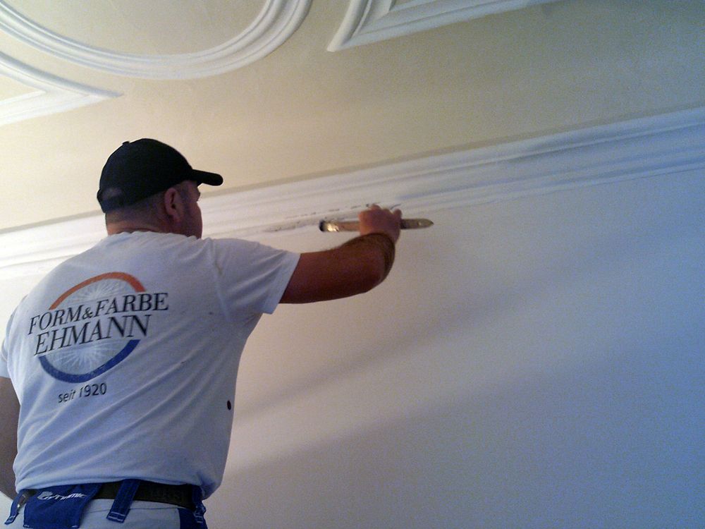 Anschließend erfolgte die mehrfarbige Neufassung von Wänden und Stuckdecke mit KEIM-Farben.