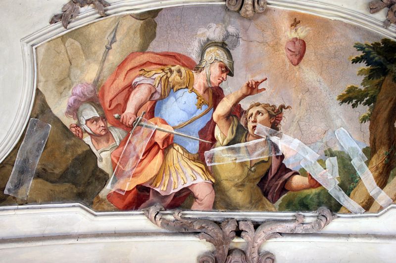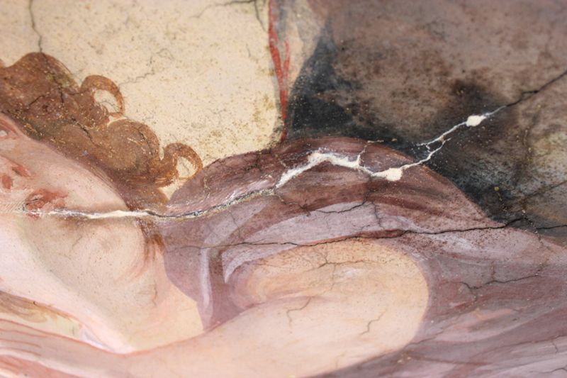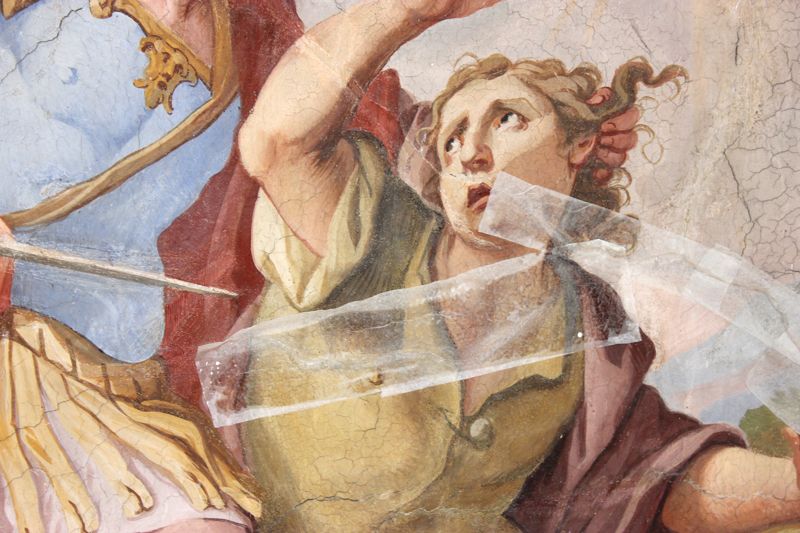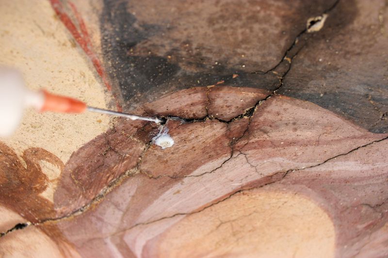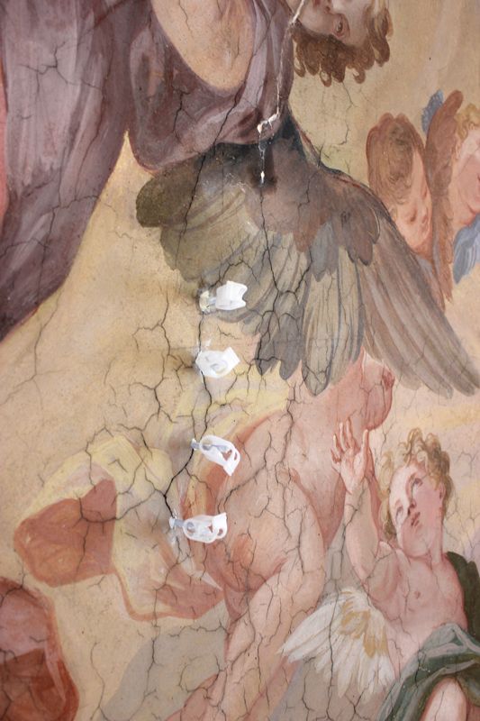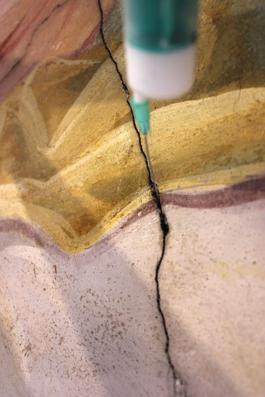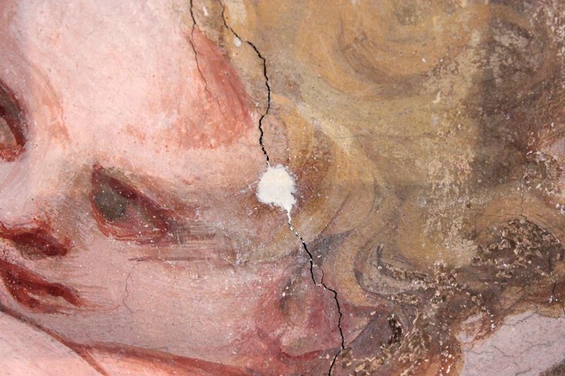 Nach einer Vorfestigung ihrer Flanken mit Primal (Primal:Wasser, 1:3) wurden breitere, den Malereibestand gefährdende Risse randgenau, verlustfrei und ohne jegliche Überschmierungen mit KEIM Universalputz fein verschlossen.