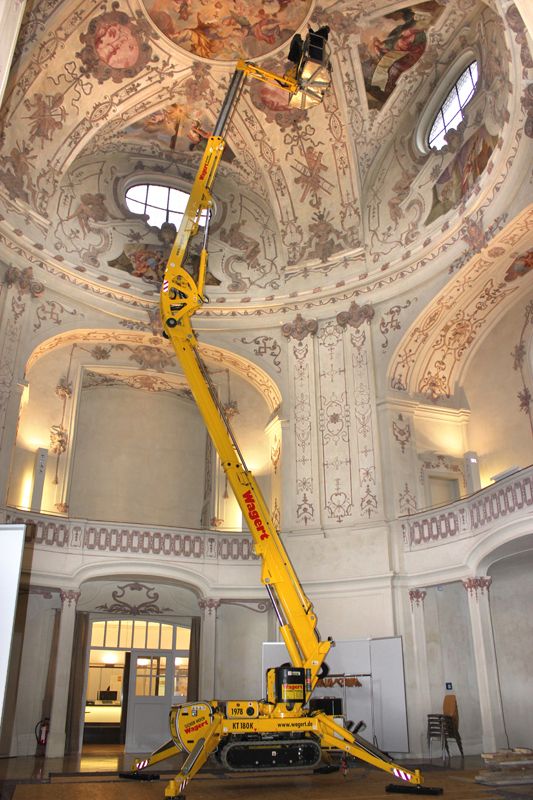 Putz, Stuck und Malerei der Kuppel sollten untersucht und gegebenenfalls einer Notsicherung unterzogen werden. Im Gegensatz zu der 2013 durchgeführten Untersuchung sollte die aktuelle Untersuchung mit einem mobilen Hubsteiger durchgeführt werden, um die Begutachtung aller Wand- und Deckenbereiche zu ermöglichen.