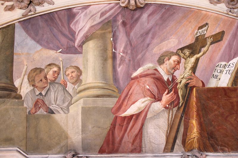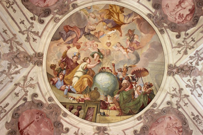 An der Südseite über der Empore wurden Stuckbereiche im Hilti-Hit-System mit Glasfaserdübeln gesichert. Vor allem der figürliche Stuck in Form eines Kopfes an der Rotunde, der umlaufend vollständig von einem tiefen Riss umgeben war, ließ eine solche Maßnahme als dringend notwendig erscheinen.
