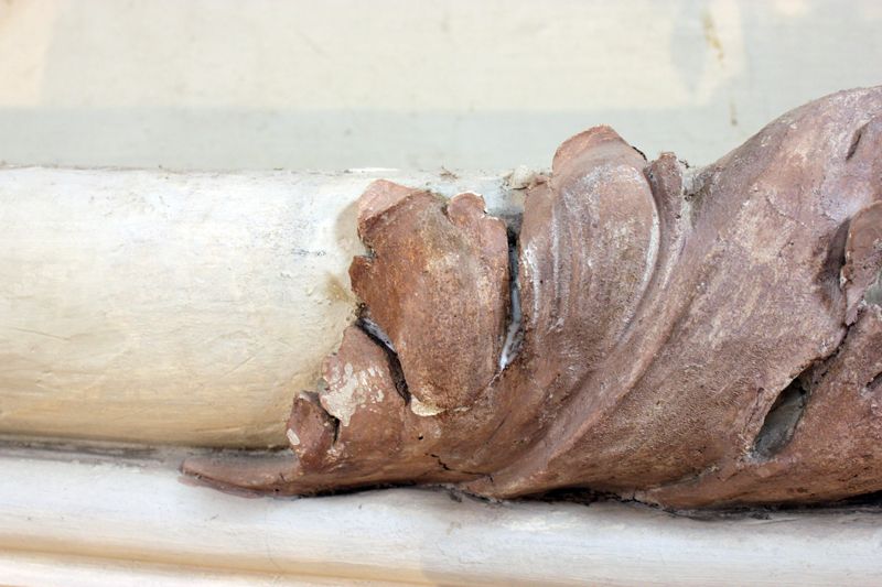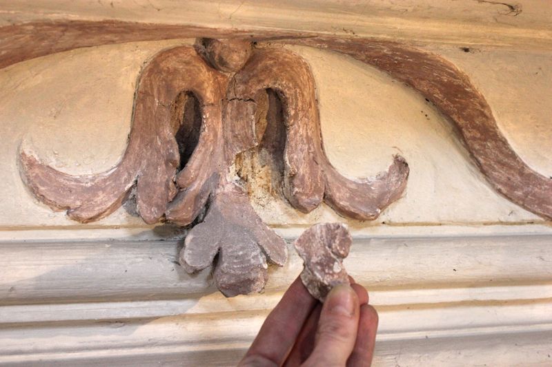 Abgelöste Stuckteile, die nur noch durch den Reibungsverlust an ihren Bruchkanten in Position gehalten wurden, konnten absolut verlustfrei herausgenommen werden. Die Putzflanken und –kanten wurden mit Primal gefestigt (Primal:Wasser, 1:3). Anschließend wurden die Stuckteile mit einer Acrylemulsion wieder angebracht. Wo nötig wurden dahinter liegende Bereiche mit KEIM Universalputz fein aufgefüttert. Bis zur Abtrocknung wurden so befestigte Teile mit speziellen, bestandsschonenden Klebebändern gesichert. Anschließend wurde die Stabilität aller wieder angebrachten Teile überprüft.