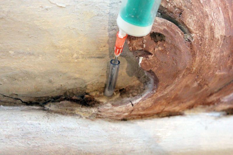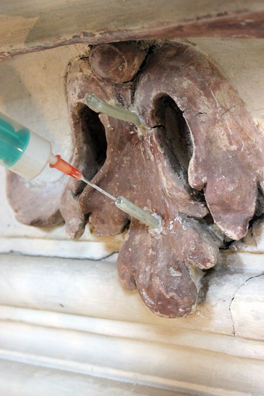 Abgelöste Stuckteile, deren Adhäsion zum umliegenden Bestand zumindest in Teilbereichen noch gegeben war, sowie hohlliegende und scheppernd klingende Putzbereiche wurden durch Hinterfüllen konsolidiert. Hierfür wurden durch schlagfreies Bohren Zugänge geschaffen und Injektionskanülen gesetzt. Nach Einbringen einer Vorfestigung (Primal:Wasser, 1:3) wurde Ledan D1 in abgestimmten Verdünnungsstufen eingebracht. Wo möglich erfolgte die Injektage per Nadeln direkt über bestehende Risssysteme oder Fehlstellen. Auch hier bestand das Hinterfüllmaterial aus oben beschriebener Vorfestigung und Injektionsmörtel. Wo nötig wurden Risse in der Umgebung mit KEIM Universalputz fein verschlossen, um einen Wiederaustritt des Mörtels zu verhindern. Nachdem die perkussive Prüfung eine Wiederanbindung hohlliegender und abgelöster Bereiche bestätigte, wurden die Injektionskanäle mit KEIM Universalputz fein randgenau und oberflächengleich wieder verschlossen.