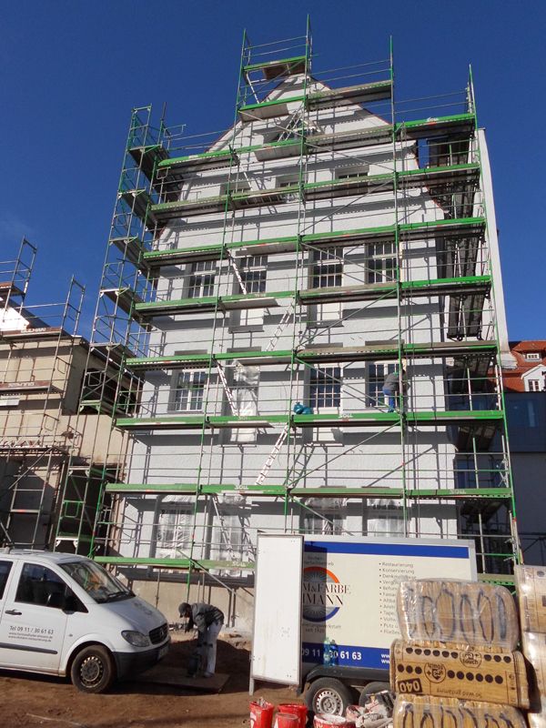 Putzhohlstellen wurden durch Abklopfen ermittelt und markiert. Schadhafte Putze und neuzeitliche, unpassende Ausbesserungen wurden entfernt. Die freigelegten Flächen wurden mit KEIM Fixativ grundiert.
