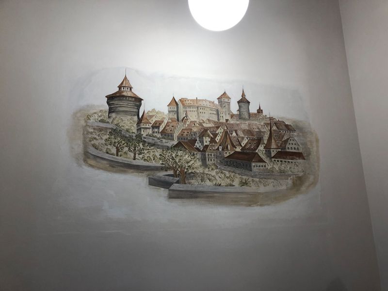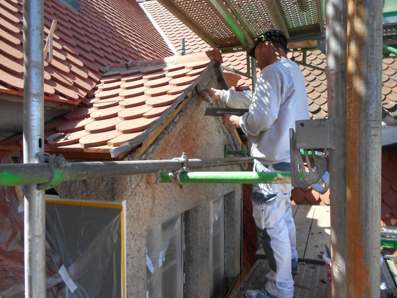 Der Vorspritzputz wurde im Trass-Sanierputzsystem netzförmig aufgebracht. Anschließend folgte Kalkputz als Unterputz, der waagerecht aufgekämmt wurde. Der Oberputz wurde mit art- und strukturgleichem Putz fachgerecht beigearbeitet und an den Bestand angeglichen. Nach ausreichender Standzeit wurden Neuputzflächen fluatiert.