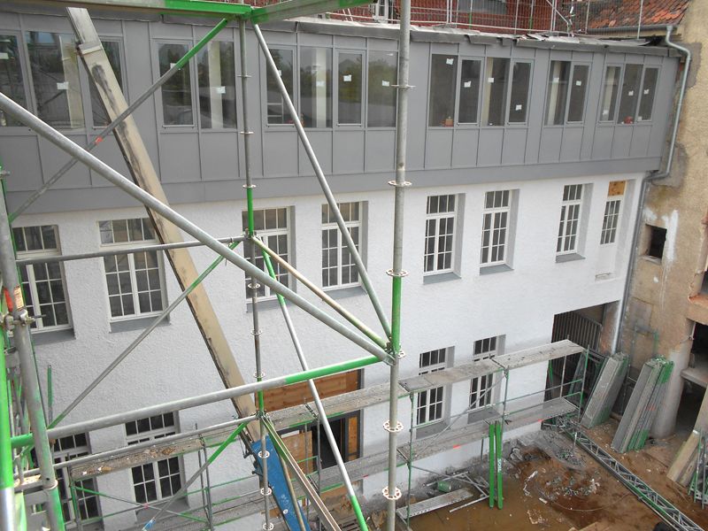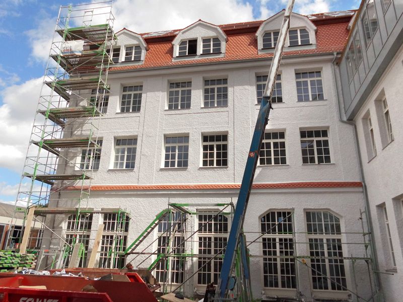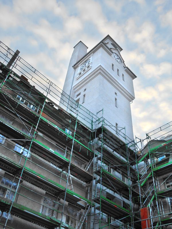 Der schöne Gebäudekomplex der VAG in Nürnberg, Muggenhof sollte komplett saniert werden. Form [&] Farbe Ehmann GmbH übernahm die Sanierung der Fassaden.