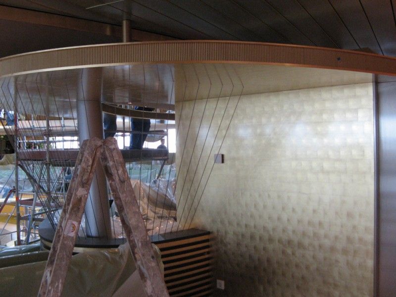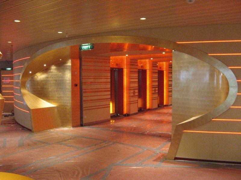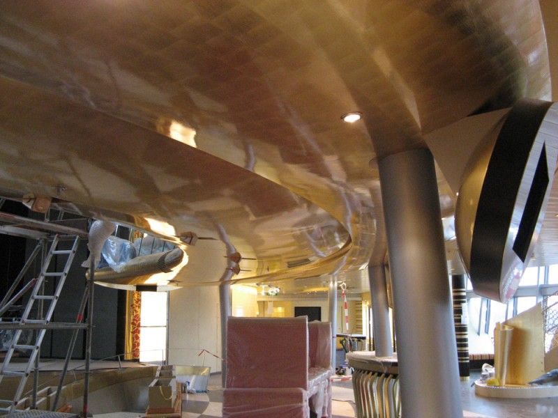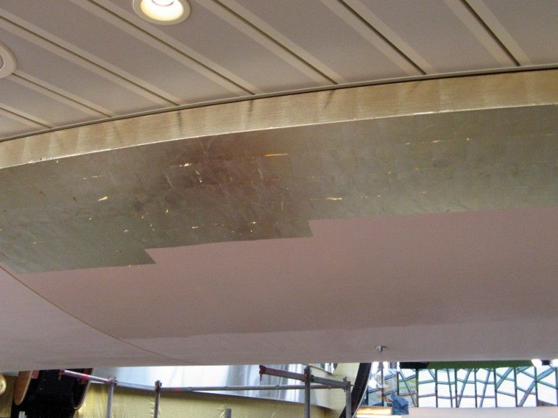 Im Inneren des Luxusliners wurden von uns Wandflächen und Ausstattungsgegenstände mit Blattgold vergoldet. Ziel war es, ganze 800 Quadratmeter in einem äußerst knapp bemessenen Zeitfenster mit einer Ölvergoldung zu versehen, bei der die Anschüsse zu sehen sein sollten. Die auf diese Weise wunderschön strukturierten Oberflächen verleihen den modernen Räumen nun eine Atmosphäre warmer Exklusivität und edler Kostbarkeit.